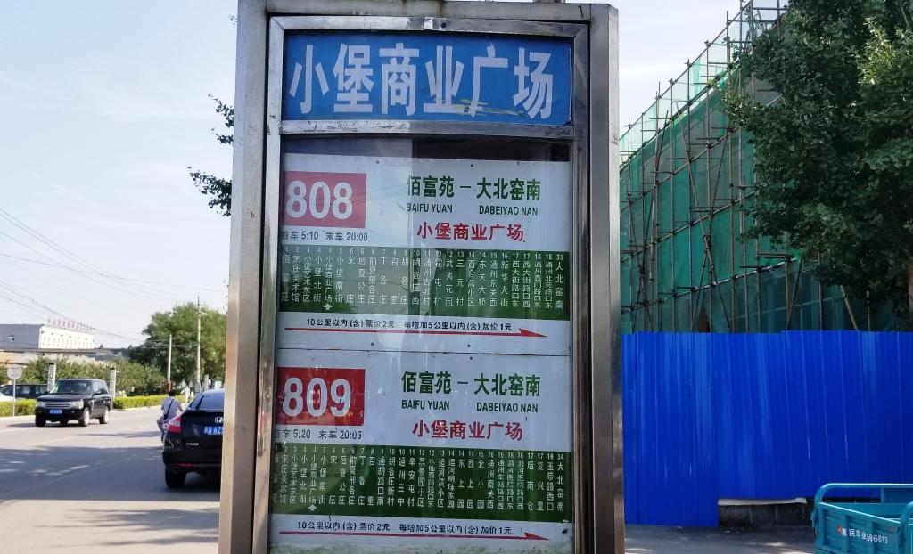 Take the 808 or 809 from the bus station under the ring road at Guomao 国贸 (also known as Dabeiyaonan 大北窑南). The 808 and 809 leave from the east side of the bus station. Get off at Xiaopu Shangye Guangchang 小堡商业广场 (pictured above). It’s 2 yuan if you have a Yikatong transport card, or 6 yuan if you pay cash.